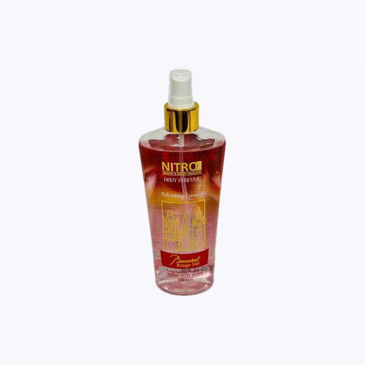 بادی اسپلش زنانه نیترو حاوی رایحه باکارات رژ با طبع گرم و شیرین کلاسیک زنانه با ماندگاری طولانی مدت و از بین برنده بوی ناخوشایند بدن ناشی از تعریق بدن است.